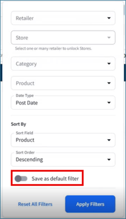 To set any chosen filters as your default view to be seen each time you log, toggle Save as default filter: