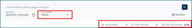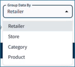 The table defaults to being organized by Retailer but can be organized by the other columns. The columns shown will be dependent on the category selected in the Group Data By filter. The Group Data By filter allows you to view sales based on retailers, stores, product categories, or specific products: