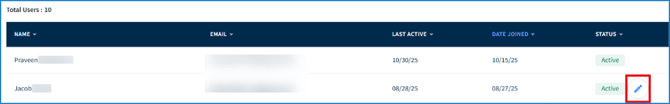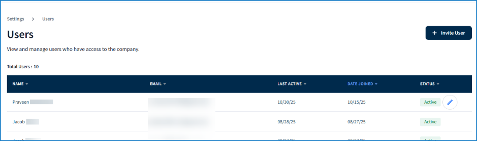Within Settings > Users, review, add, or edit your company’s user accounts for the portal. portal. Details shown in the table include a user’s name, email, the last time they were active in the portal (Last Active), when their account was created (Date Joined), and their user status: