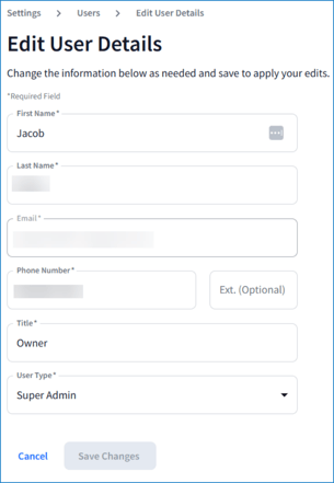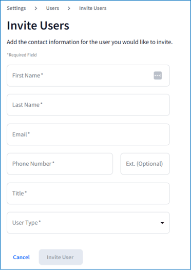 - Add the user’s information: first name, last name, contact number, email address, job title (this can be edited later if you are unsure), and user type: