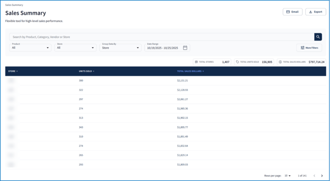 - Group by Store to view the store ID, units sold (number of products scanned at checkout), and total sales dollars per location.
