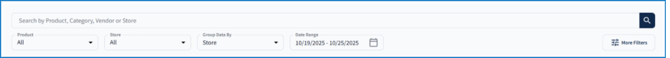 Use the search bar to find specific sales by product name, product category, vendor, or store number. Refine results by selecting particular products or stores from the Product or Store dropdown menus. View sales based on the time period in which they were posted using the Date Range filter.