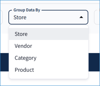 The Group Data By filter organizes sales by store, product category, vendor, or individual product:
