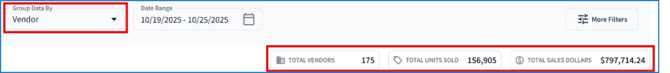 - Group by Vendor displays vendor names, units sold, purchasing costs per vendor, and the count of stores each vendor is authorized to deliver to.