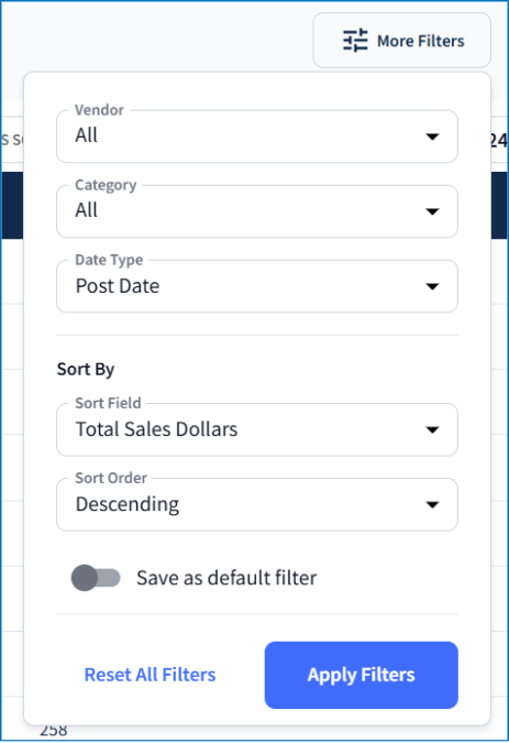 Use More Filters to further refine your results by Vendor, Category, and Date Type. The Sort By fields can organize the table by a specific column. If you'd like your current filters to appear each time you log in, toggle Save as default filter: