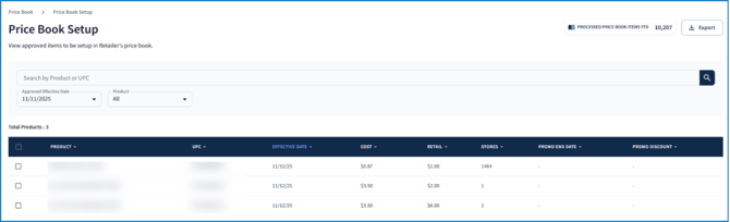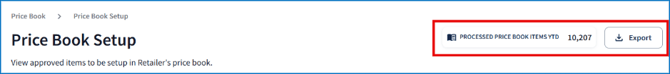 In the top right corner of the screen, the total number of price book requests that have been completed in the current year will be displayed (Processed Price Book Items YTD). To download the current table view as a CSV file, click Export: