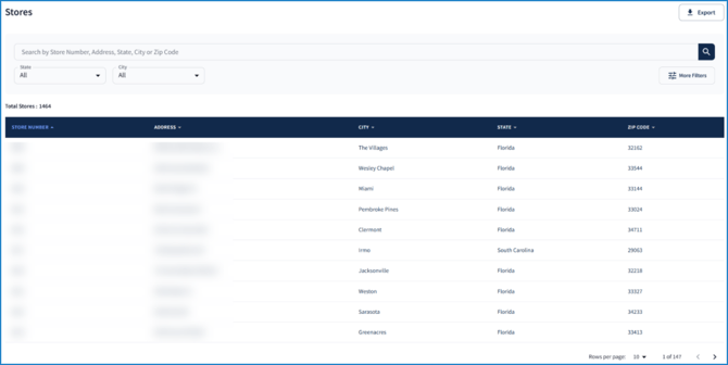 Here, each store’s ID (Store Number) along with location details is displayed. Use the search bar, state and city dropdowns, or the More Filters button to refine table results: