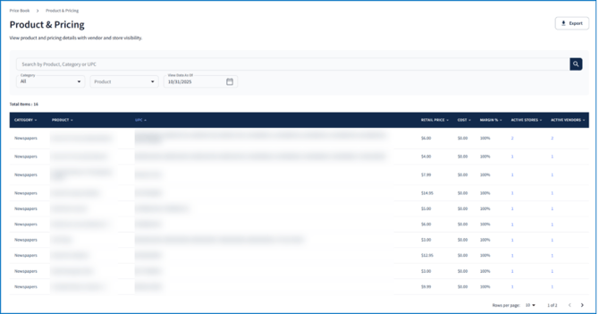 In Product and Pricing, review comprehensive product details from your price book, including each item's category, product name, UPC number(s), retail price, purchase cost, margin, the number of stores receiving the product, and the vendors authorized to deliver it: