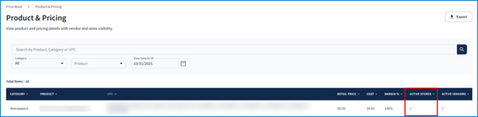 To view which store(s) are carrying a product, click the number in the Active Stores column on the product's row: