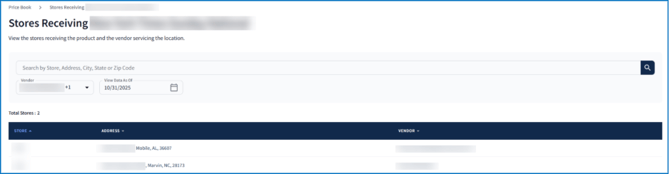 Use the search bar to find a specific store by name, address, city, state, or zip code. Limit the stores shown based on their vendor relationship using the Vendor dropdown. Select a date from View Data as Of to display only those stores authorized to receive the product on or after the selected date.