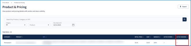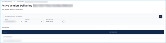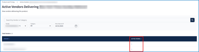 View all vendors that deliver the selected product and the count of stores they are authorized to deliver to (Active Stores). The table defaults to being organized by Vendor, but select the Active Stores header to organize it by that field instead: