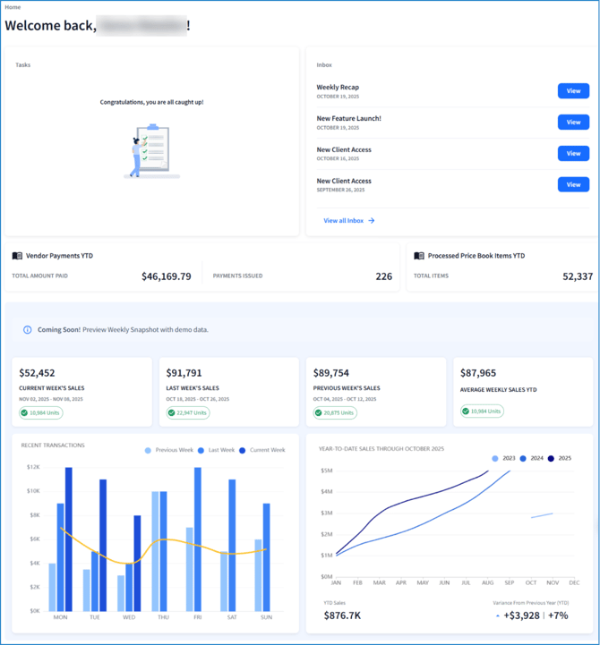 View account to-do's, news, and data snapshots on the Home page.
