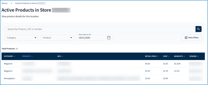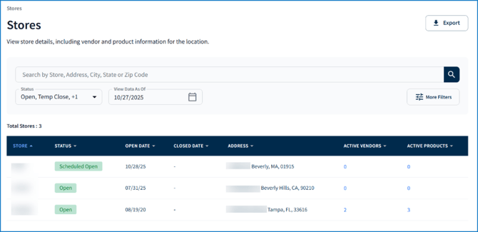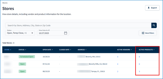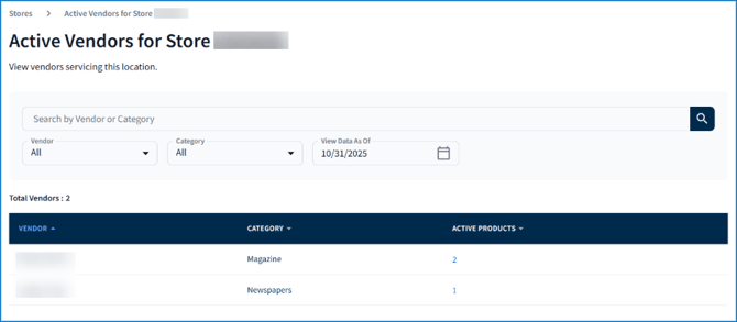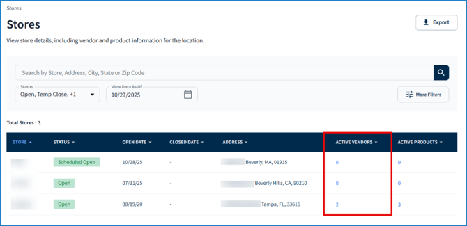 💡 The date chosen in View Data as Of can affect the table results. A store may have active vendors but 0 active products if vendor authorization to deliver products has not been completed as of the chosen date. For example, a vendor may not be authorized to deliver a specific product to the one store they have a relationship with until 11/20. Therefore, the count of their Active Products would be 0 if View Data as Of was 10/30.