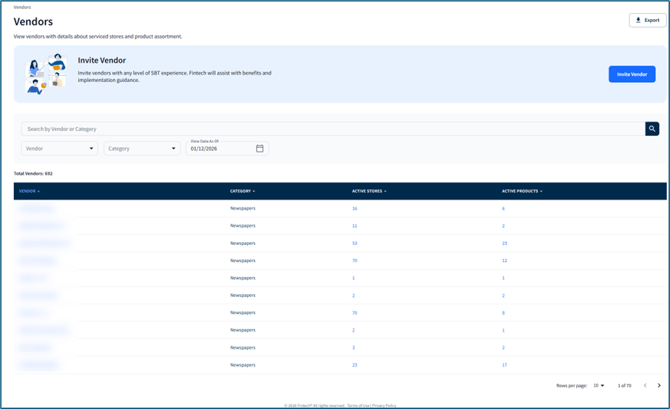 💡 The date chosen in View Data as Of can affect the table results. A vendor may have active stores but 0 active products if authorization to deliver products has not been completed as of the chosen date. For example, a vendor may not be authorized to deliver a specific product to the one store they have a relationship with until 11/20. Therefore, the count of their Active Products would be 0 if View Data as Of was 10/30.