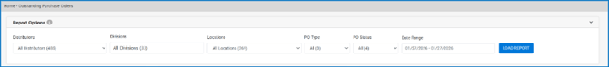 The Outstanding Purchase Order screen serves as the record of all PO’s received by Fintech. To narrow down your search, use one or more of the filter options provided, then click Load Report: