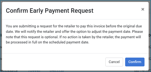 You can also request any of your retailers to make an early invoice payment at their discretion. Please note that you cannot request a retailer pay an invoice by a specific date, only that the invoice be paid before it's due.