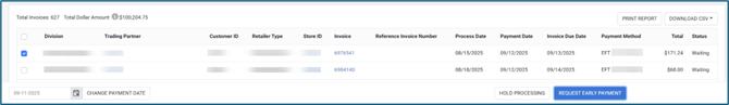 All retailers using our paid services will have the option to log into their FMS or Fintech Portal account and schedule an early payment for any of their pending invoices, or for invoices that you've requested be paid early.
