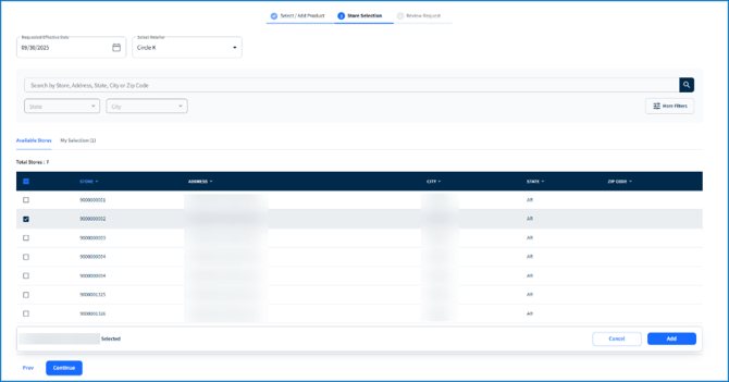 To review or remove any selected locations, go to My Selection, then either hover over a store and click the trash can icon, or select multiple stores and click Remove from my selection: - Review your request before clicking Submit. To make changes, select Prev to return to the previous steps:
