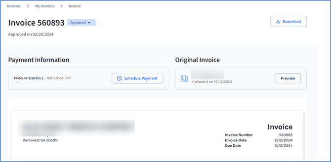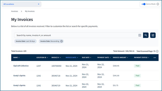 With a Lite or higher subscription, click on a row within the table to view a digital copy of the invoice. You also can download a PDF version of the digital invoice and preview the original invoice. If you are managing non-alcohol invoices, you can schedule payment.