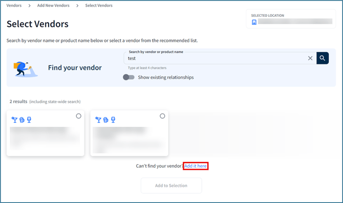 - Select the location you want to add the vendor to from the list, then click Continue.