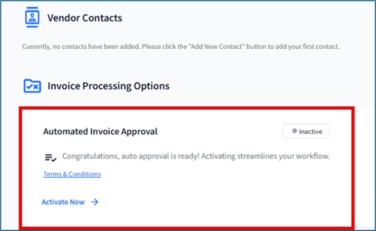 ⚠️ Deactivating auto approve will make invoices with a Processing status change to Needs Review. You will need to manually edit and approve the invoice. Manually schedule the payment if you do not have Auto Pay active.