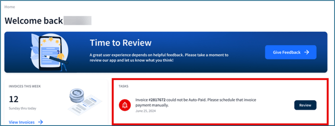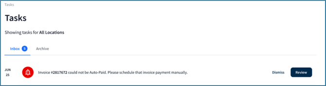 - Tasks tab - Click Review to see failure details or Dismiss to archive the task. You will still need to manually schedule a payment if you Dismiss the task: