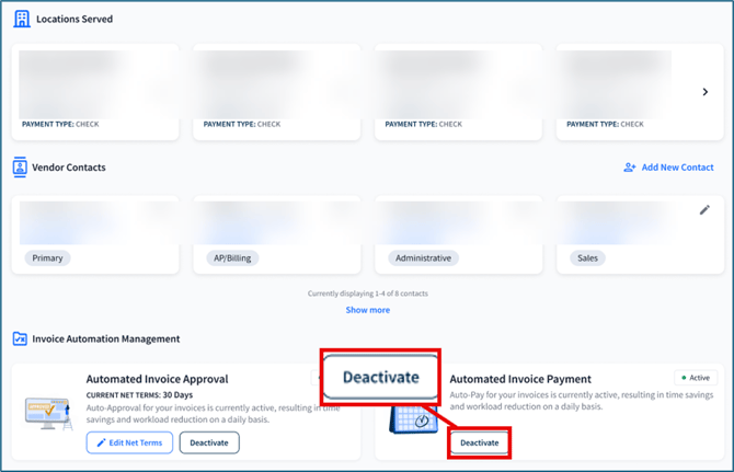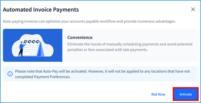 Enabling Auto-Pay will apply to all locations served by that vendor. If payment preferences are not established for a location, Auto-Pay will not apply to them. For more information on setting payment preferences, click here: What options do I have to pay invoices?