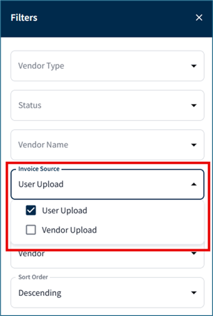 From Vendors > My Vendors, filter the table by User Uploaded invoices under Invoice Source, then select the vendor from the table:
