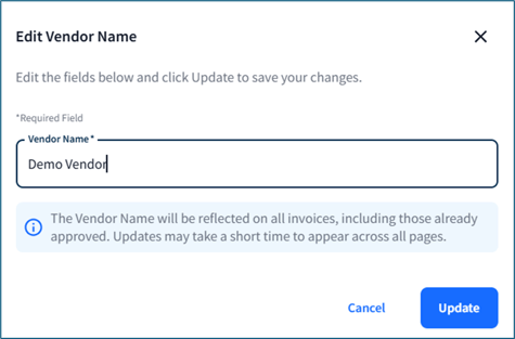 ⚠️ To edit a vendor's name, you must have a Premium or Premium Plus subscription and upload non-regulated invoices. Only vendors associated with these invoices can have their names edited. Name changes will apply to all invoices, including those already approved.