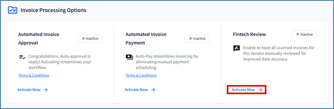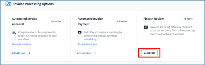By disabling this feature, uploaded invoices skip Fintech Review and are processed within minutes, letting you approve invoices and schedule payments at a much faster rate.