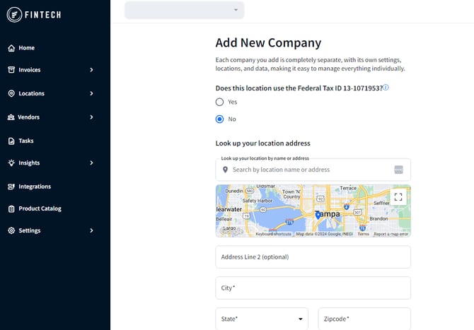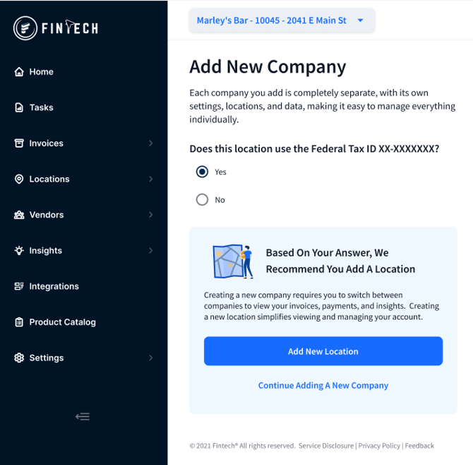Consider adding a new company in the Fintech Portal when you have a separate legal entity to register. A separate entity will have its own Federal Tax ID.