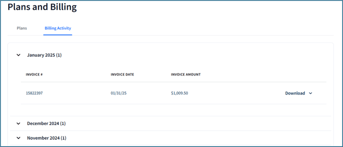 View payment records in the Billing Activity tab, including plan charges, subscription fees, credits, reversals, and more. The weekly operational emails you receive will detail when billing invoices are available for review.