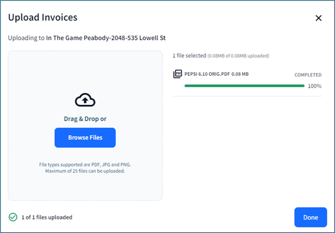 Uploaded invoices will appear within the Invoices > Manage Invoices section of the portal within 24-48 hours from time of upload.