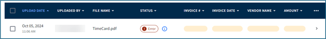 ⚠️ If an invoice has an Error status, hover over the i icon to review the reason for the failed upload. Depending on the error, you will have to edit the invoice or select, delete, and re-upload: